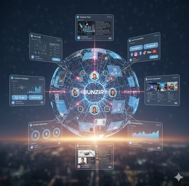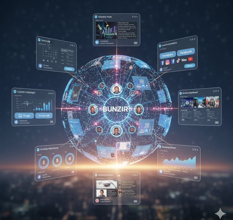 Com um painel intuitivo, o usuário conecta redes sociais e canais de vendas para que a Bunzir automatize tarefas essenciais: criar posts, gerar anúncios, gerenciar campanhas, atender clientes e analisar resultados. Tudo em um só lugar — simples, rápido e escalável, sem depender de várias ferramentas ou agências caras.